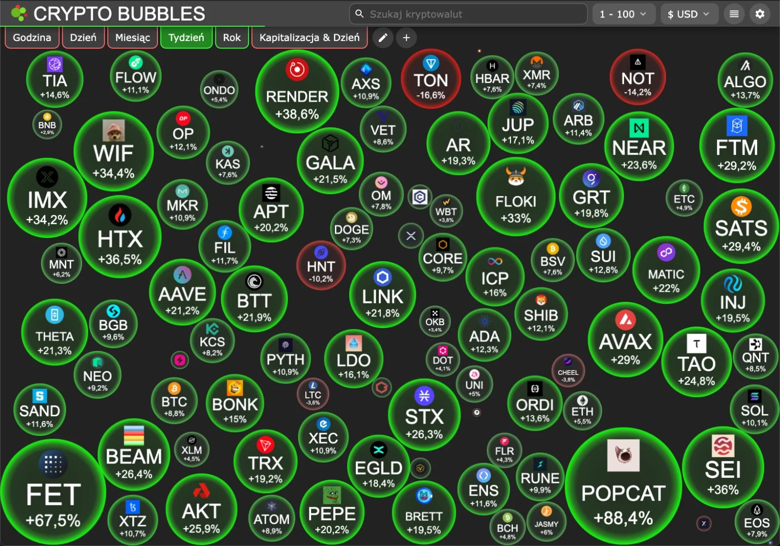 💥 Mamy lekkie odbicie rynku, zielono – FET zrobił fajny ruch, a mówiłam już o nim ponad 2 lata temu, dlatego dobrze obserwuje się te wszystkie krypto związane z AI czy nowymi technologiami, które robią lepszy wynik niż niektóre memecoiny (choć POPCAT na szczycie).