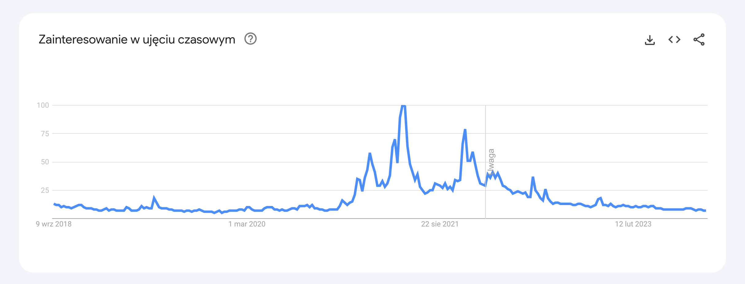Poniżej wykres tego, jak kształtowało się zainteresowanie rynkiem cyfrowych aktywów przez ostatnie 5 lat. Rok 2023 nie był rokiem krypto, zdecydowanie!