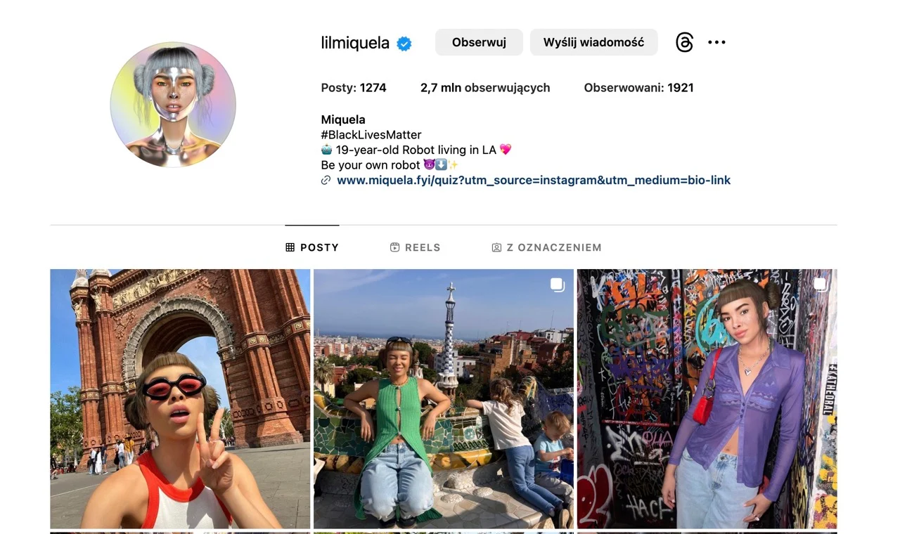 Absolutna królowa świata wirtualnych influencerek @lilmiquela. Jeśli kojarzysz moje wyzwanie blockchainowe (swoją drogą, jak dawno to było!) to kojarzysz jej nick. :D