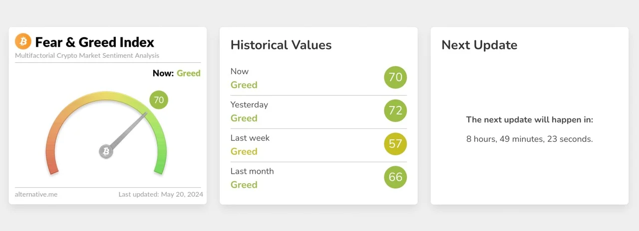 Na rynku wciąż panuje chciwość, jak to bywa w czasie hossy. No cóż, bo nadal mamy hossę i Bitcoin znów kosztuje ponad 68k dolarów. W końcu dzisiaj minął 31 dzień od halvingu, a jeśli spojrzymy sobie na wykresy historyczne, wzrosty zaczynały się między 30, a 60 dniem od halvingu… ;)