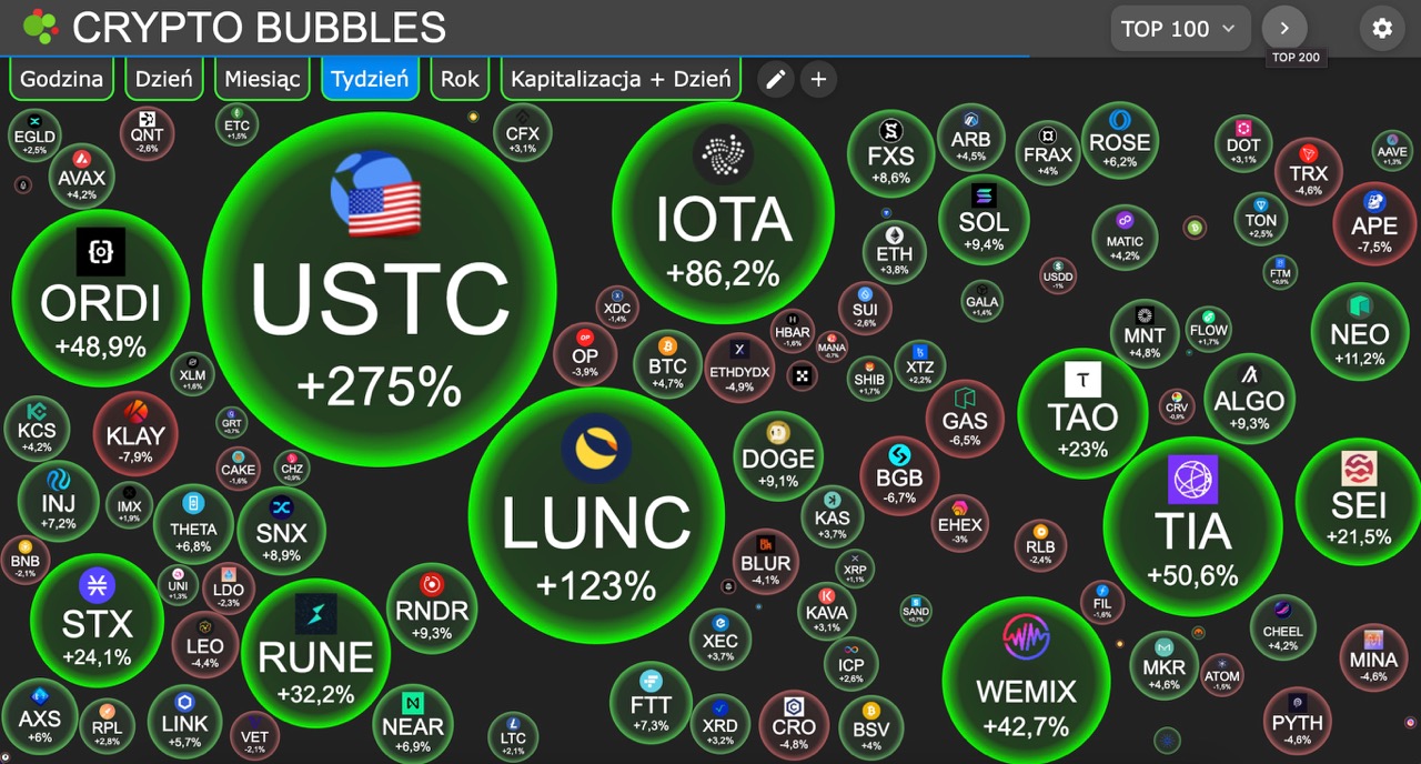 Niezłe wzrosty (i trochę czerwieni). Najmocniej odżyły projekty związane z Terra LUNĄ (USTC i LUNC), której upadek w 2022r. doprowadził do (prawdopodobnie) największego krachu na rynku kryptowalut.