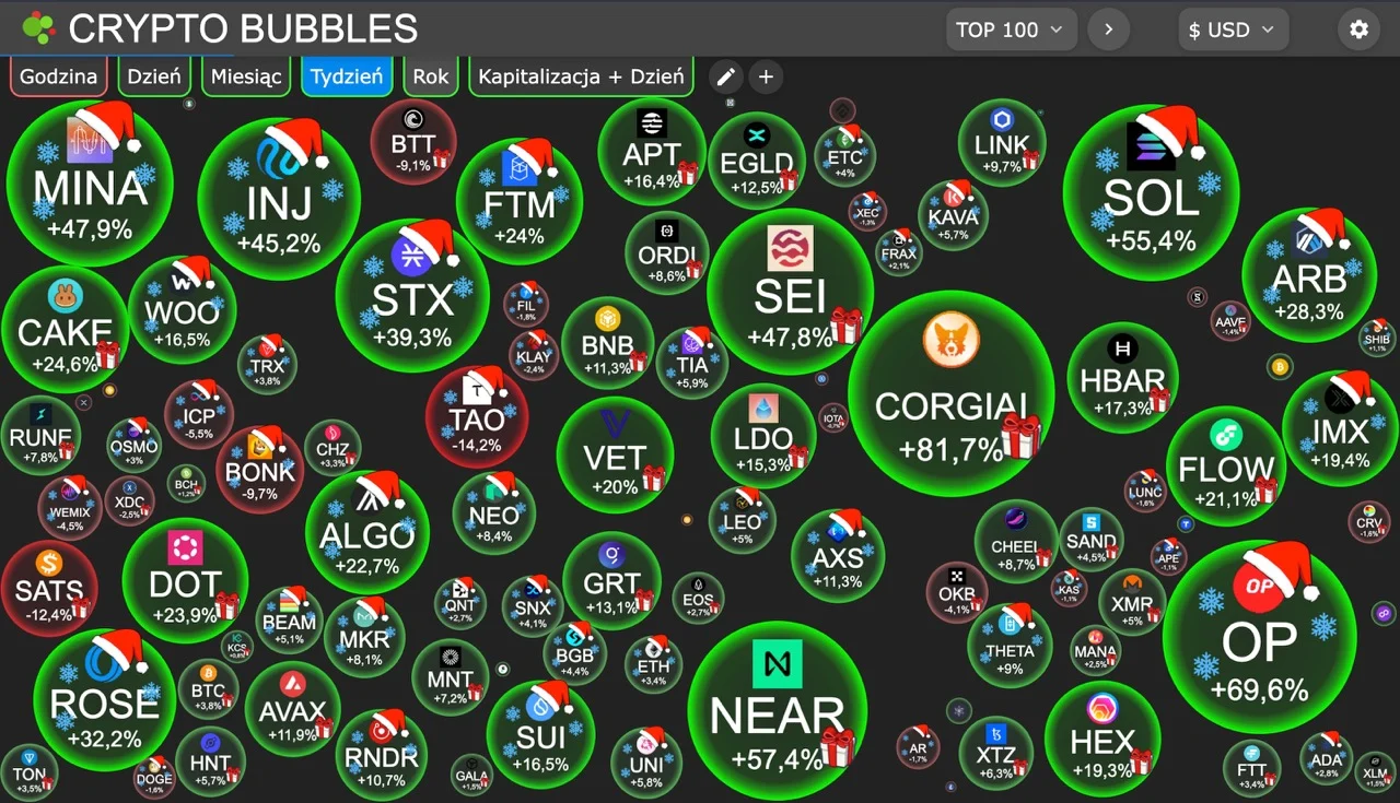 💥 Świąteczna edycja crypto bubbles! Znów dominuje zieleń, sporo projektów zaliczyło fajne wzrosty. Czy to rajd świętego Mikołaja czy może coś innego?