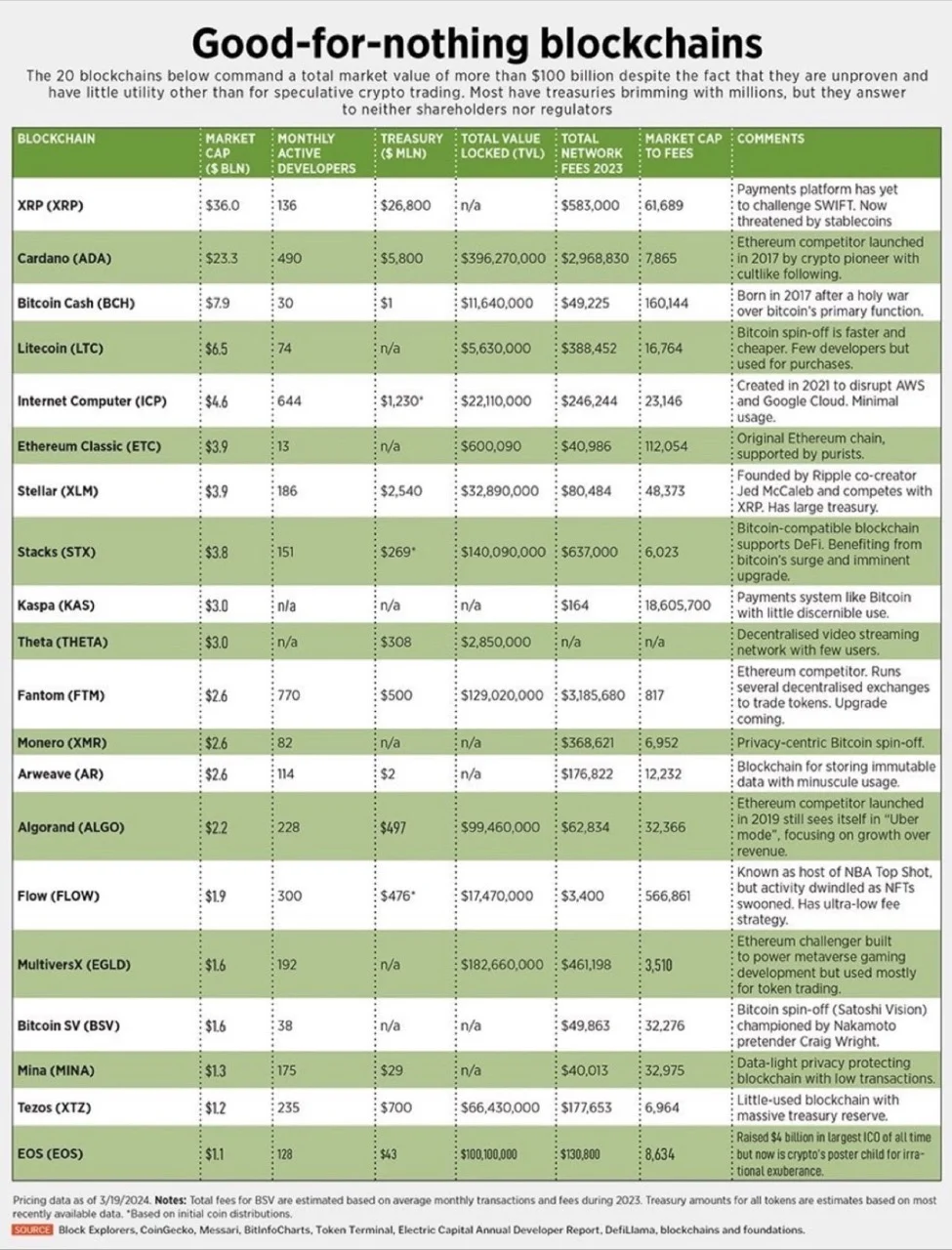 💥 Forbes podzielił się listą tzw. tokenów zombie, czyli kryptowalut, które są wycenione na mnóstwo dolarów, jednak mają minimalną użyteczność (lub nie mają jej wcale). Wg analityków Forbesa mają one wartość jedynie spekulacyjną aniżeli technologiczną. Poniżej wrzucam listę (źródło: Forbes), choć oczywiście tylko i wyłącznie w celach poglądowych – ja sama mam sporo XRP i ADA, a także LTC i nie wyprzedaję ich teraz w panice, bo Forbes tak napisał. xD Warto jednak mieć to na uwadze i pamiętajmy, że wartość kryptowalut przede wszystkim zależy od nastrojów rynkowych, a nie faktycznych wartości fundamentalnych (choć może to się zmieni w długoterminowej perspektywie).