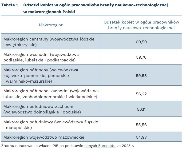 W opublikowanym w „Tygodniku Gospodarczym PIE” Polski Instytut Ekonomiczny podkreślił, że w 2023 roku na jakieś 80 milionów pracowników branży naukowo-technicznej w UE, kobiety stanowiły 52%. 🥰 Polska wyróżnia się jednym z najwyższych odsetków kobiet w tej branży, przekraczając 58% w trzech makroregionach: centralnym (60,59%), wschodnim (59,70%) i północnym (59,58%). Niżej szczegółowa tabela: